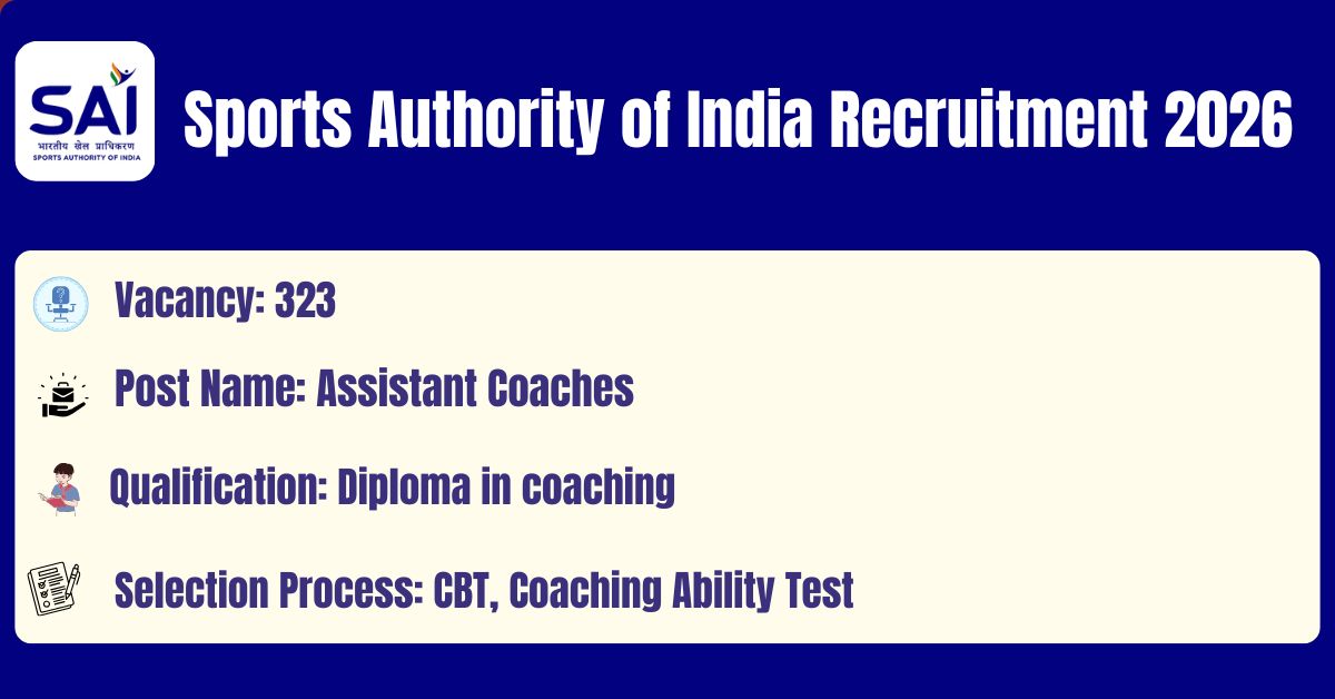 SAI has released the recruitment notification to fill the 323 Assistant Coaches Posts. This online facility will be available on the Official website @ https://sportsauthorityofindia.nic.in/ from 23.03.2026 to 21.04.2026 at 05.00 PM. Before submitting an application, candidates must carefully read the SAI Assistant Coach 2026 notification and verify their eligibility.