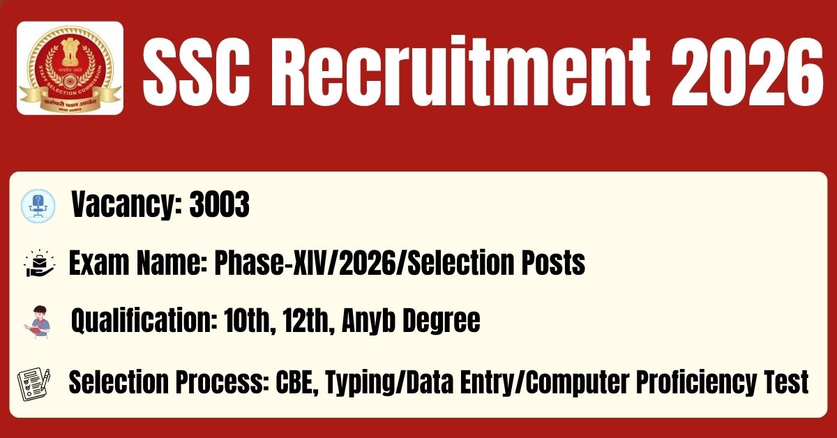 The Staff Selection Commission has released its latest official recruitment notification (Advt. No. HQ-RHQS015/1/2026/C-4) to fill the 3003 Phase-XIV/2026/Selection Posts Posts. Applicants may get the details of On-line Application, Detailed Advertisement, General Instructions and apply Online on the official Web-site of this Staff Selection Commission i.e. https://ssc.gov.in/. The link for submission of On-line Application Form will remain active from 13.04.2026 to 04.05.2026.
