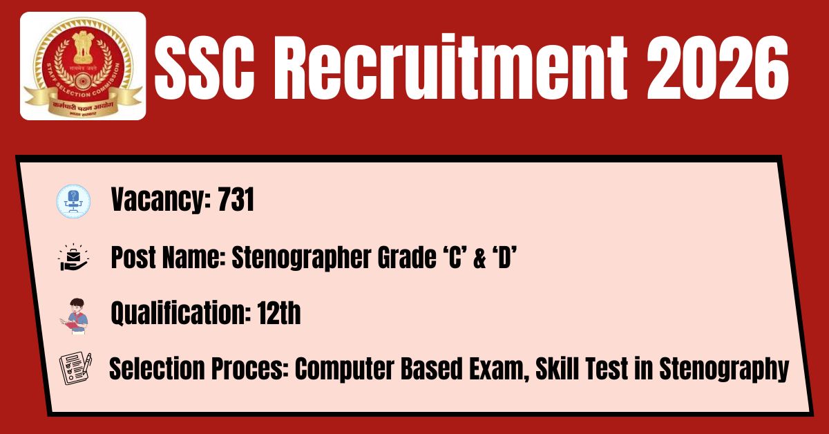The Staff Selection Commission (SSC) has released its latest official recruitment notification (Advt. No. E/13/2026-C-2) to fill the 731 Stenographer Grade ‘C’ (Group ‘B’, Non- Gazetted) and Stenographer Grade ‘D’(Group ‘C’ Posts. Applicants meeting the requirements notified may submit their application through online mode from 24.04.2026 to 15.05.2026 and the Online Application form facility can be accessed through Staff Selection Commission website https://ssc.gov.in/ (Career Page).