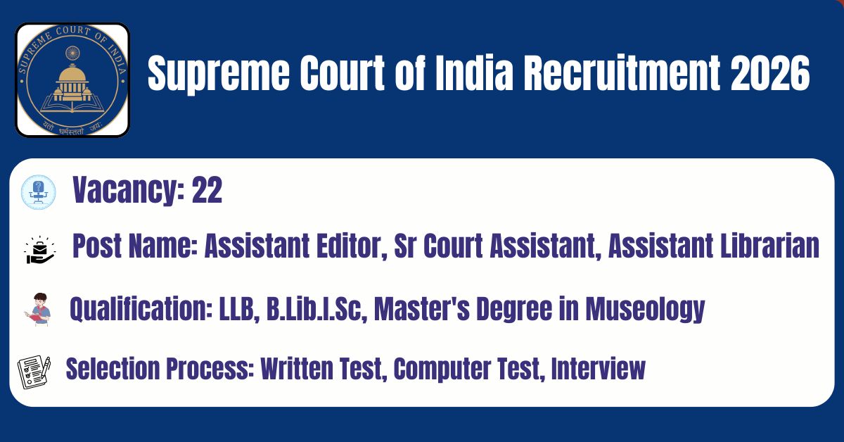 Supreme Court of India has released the recruitment notification No: F.6/RC-2025  to fill the 22 Assistant Editor, Assistant Director (Ex-cadre), Senior Court Assistant (Ex-cadre), Assistant Librarian Posts. This online facility will be available on the Official website @ https://www.sci.gov.in/recruitments/ from 23.02.2026 to 08.03.2026. Before submitting an application, candidates must carefully read the Supreme Court of India Assistant Librarian 2026 notification and verify their eligibility.
