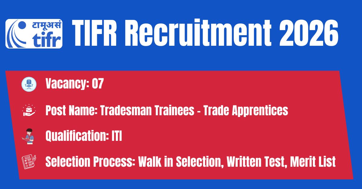 The Tata Institute Of Fundamental Research has released its latest official recruitment notification (Advt. No. 2026/2) to fill the 07 Tradesman Trainees – Trade Apprentices Posts.The online application portal at the official website (https://www.tifr.res.in/) will remain active from 02.03.2026 to 23.03.2026. Before submitting an application, candidates must carefully read the TIFR Tradesman Trainee 2026 notification and verify their eligibility.