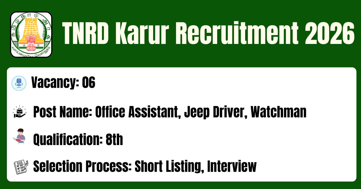 TNRD Karur has released the recruitment notification to fill the 06 Office Assistant, Jeep Driver, Watchman Posts. The application form should be downloaded in PDF format from the official website @ https://Karur.nic.in/. The last date for the receipt of Filled application along with all enclosures is 13.02.2026. Before submitting an application, candidates must carefully read the TNRD Karur Office Assistant notification and verify their eligibility.