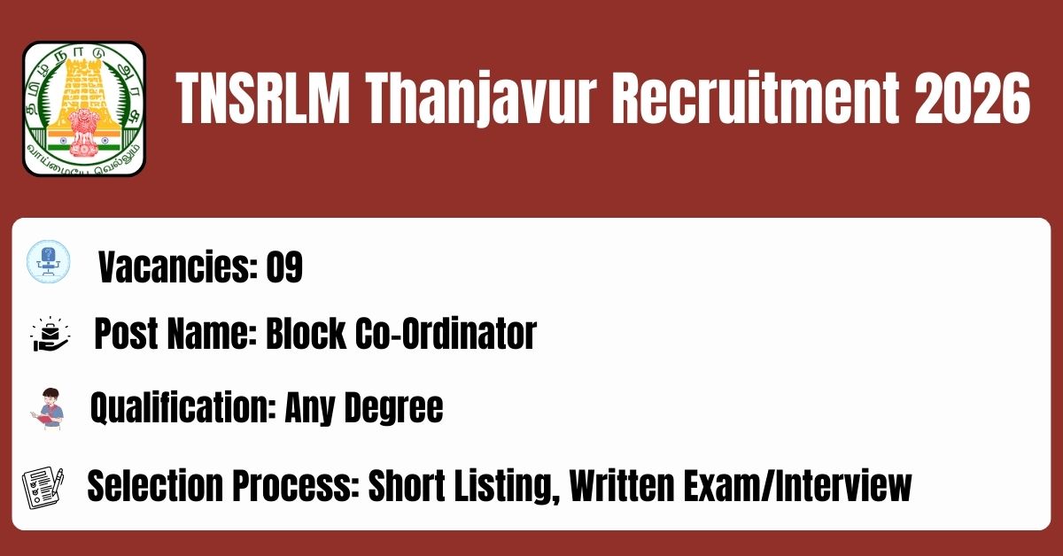 TNSRLM Thanjavur has released the recruitment notification to fill the 09 Block Coordinator Posts. The application form should be downloaded in PDF format from the official website @ https://Thanjavur.nic.in/. The last date for the receipt of Filled application along with all enclosures is 16.02.2026. Before submitting an application, candidates must carefully read the TNSRLM Thanjavur Block Coordinator notification and verify their eligibility.