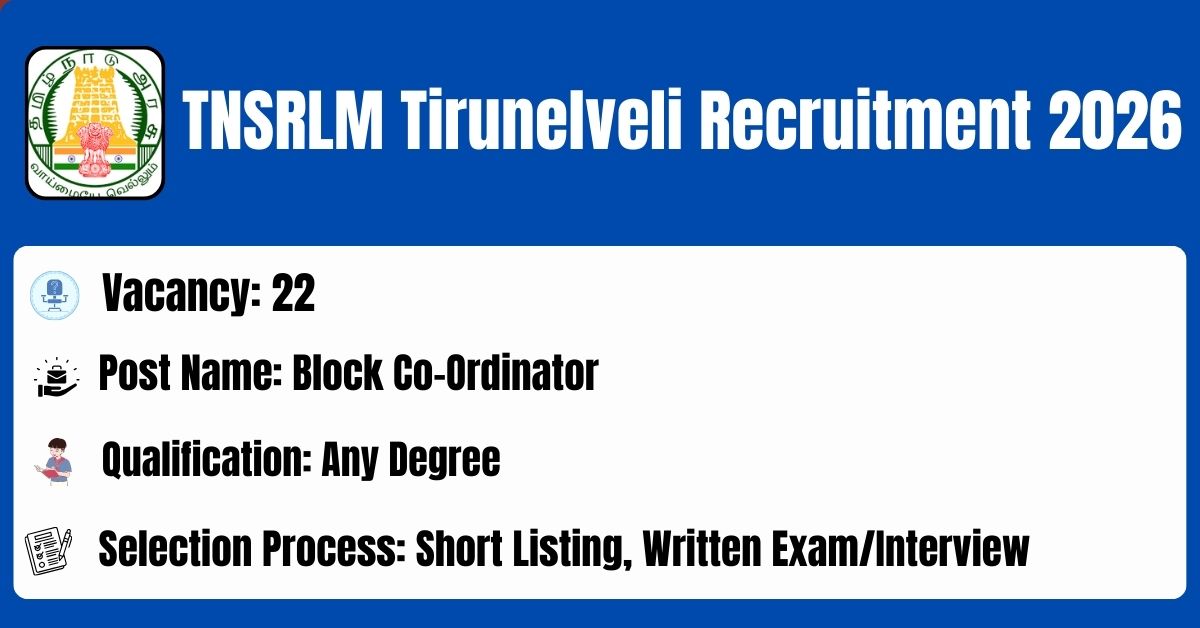 TNSRLM Tirunelveli has released the recruitment notification to fill the 22 Block Coordinator Posts. The application form should be downloaded in PDF format from the official website @ https://Tirunelveli.nic.in/. The last date for the receipt of Filled application along with all enclosures is 16.02.2026. Before submitting an application, candidates must carefully read the TNSRLM Tirunelveli Block Coordinator notification and verify their eligibility.
