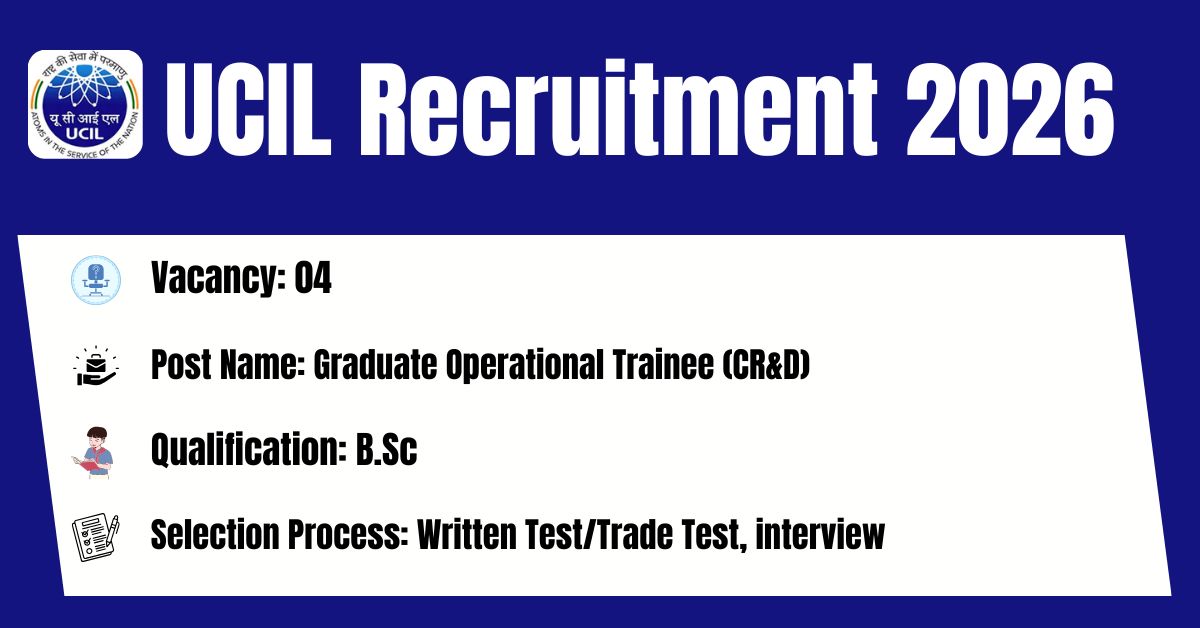 The Uranium Corporation of India Limited (UCIL) has released its latest official recruitment notification (Advt. No. UCIL- 10-2026) to fill the 04 Graduate Operational Trainee (CR&D) Posts. Candidates may get the details of On-line Application, Detailed Advertisement, General Instructions and apply Online on the official Web-site of this Uranium Corporation of India Limited (UCIL) i.e. https://ucil.gov.in/. The link for submission of On-line Application Form will remain active from 24.04.2026 to 23.05.2026.