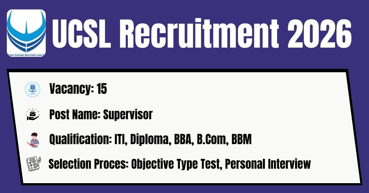 The Udupi Cochin Shipyard Limited has released its latest official recruitment notification (Advt. No. UCSL/IMS/HR/VN/F/11-SUP/MEF/67 dated 02 April 2026) to fill the 15 Supervisor (Mechanical), Supervisor (Electrical), Supervisor (Finance), Posts. Candidates may get the details of On-line Application, Detailed Advertisement, General Instructions and apply Online on the official Web-site of this Udupi Cochin Shipyard Limited i.e. https://cochinshipyard.in/. The link for submission of On-line Application Form will remain active from 02.04.2026 to 22.04.2026.
