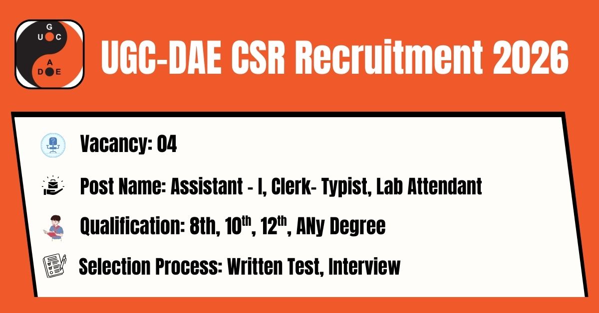 The UGC-DAE Consortium for Scientific Research (UGC-DAE CSR) has released its latest official recruitment notification (Advt. No. 06-2026) to fill the 04 Assistant – II, Assistant – I, Clerk- Typist, Lab Attendant Posts.The online application portal at the official website (https://admin.csr.res.in/) will remain active from 16.02.2026 to 06.03.2026. Before submitting an application, candidates must carefully read the UGC-DAE CSR Clerk, Assistant 2026 notification and verify their eligibility.
