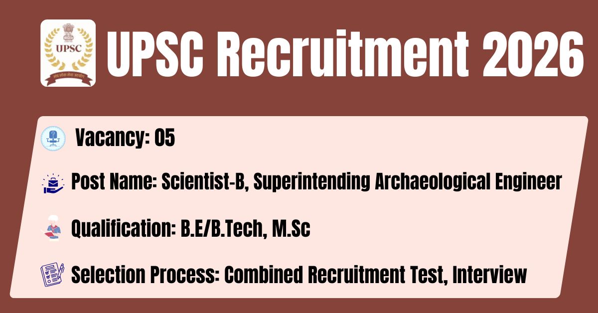 The Union Public Service Commission has officially announced a massive 2026 recruitment Notification (Advt. No. 03/2026) to fill 05 Scientist-B (Mechanical), Scientific Officer (Non-Destructive), Superintending Archaeological Engineer, Assistant Professor vacancies. The applicants satisfying the requisite qualification may apply through ONLINE MODE only, Apply Online on the official Web-site of this Union Public Service Commission i.e. https://upsc.gov.in/. The online application portal will be opened on 25.04.2026 for filling online applications and the date for closing the online application interface is 15.05.2026.