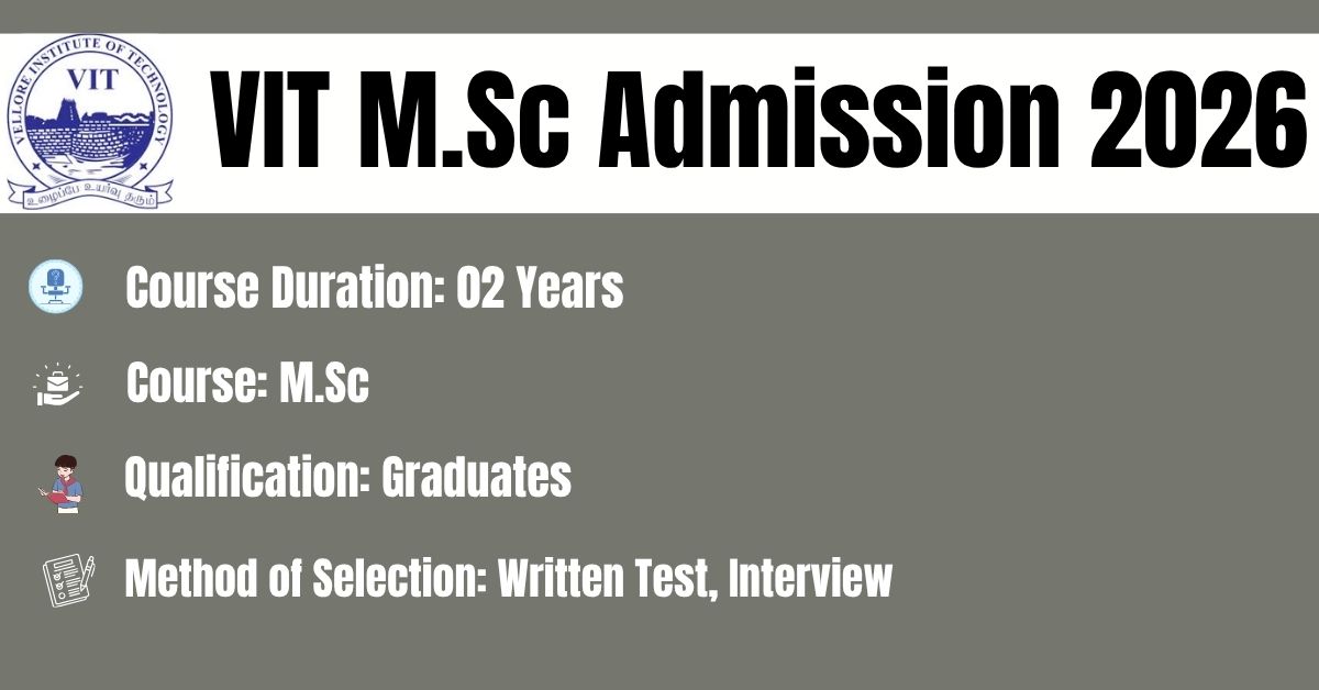 - Interested candidates satisfying the eligibility criteria are required to apply online. The link of the online application is: https://admissions.vit.ac.in/ with M.Sc tab. The official online registration window is set to open on 31.10.2025 and will remain active until 12.04.2026.