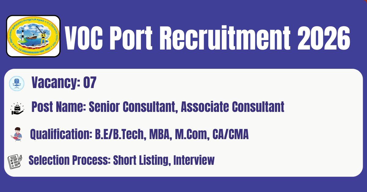 VOC Port has released the recruitment notification No: GAD-EST10ESTC(EST)/6/2025-GAD(7433)/D 274 to fill the 07 Finance – Senior Consultant, Finance – Associate Consultant, Admin – Associate Consultant Posts. The application form should be downloaded in PDF format from the VOC Port website @ http://www.vocport.gov.in/. The last date for the receipt of Filled application along with all enclosures is 16.03.2026. Before submitting an application, candidates must carefully read the VOC Port Associate Consultant notification and verify their eligibility.